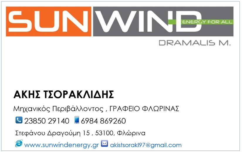 Η εταιρεία μας SUNWIND DRAMALIS θα αναλάβει για εσάς την αδειοδότηση και κατασκευή του φωτοβολταϊκού συστήματός σας, καθώς και την εκπόνηση της ενεργειακής μελέτης παρέχοντας ανταγωνιστικές τιμές εξοπλισμού, ανταποκρινόμενη στις απαιτήσεις του πελάτη. Για περισσότερες πληροφορίες παρακαλώ επικοινωνήστε με την εταιρεία μας στα παρακάτω στοιχεία επικοινωνίας :